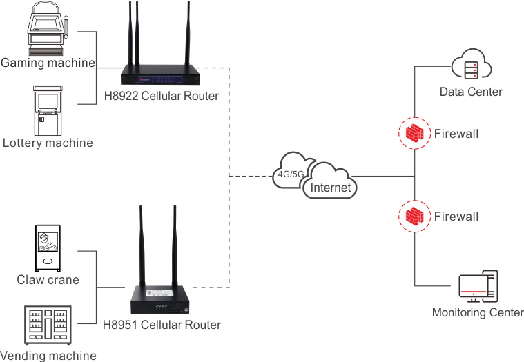 Thanks to 4G/5G wireless technology, Hongdian provides 4G/5G router solution, which has successfully deployed in many countries, to overcome all the above limitation of cable network connection. Hongdian 4G/5G router, with Industrial class design, metal case, be suit for lottery machine connecting application, embedded two 4G module, can support different operator network in one router, supports dual SIM card auto-switch hot backup, and can appoint which 4G module is primary and backup; it almost no pause or delay when link switch. Supports IPSec VPN data protection and ISP private network providing the most secure tunnel for data transmission. Secure, stable, Reliable, flexible makes your lottery service perfect.