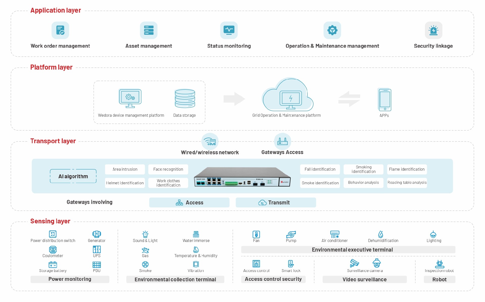 Continuous all-round monitoring of main power equipment and environment in the distribution room, providing more comprehensive data support for the analysis, diagnosis, operation and maintenance of equipment running status.